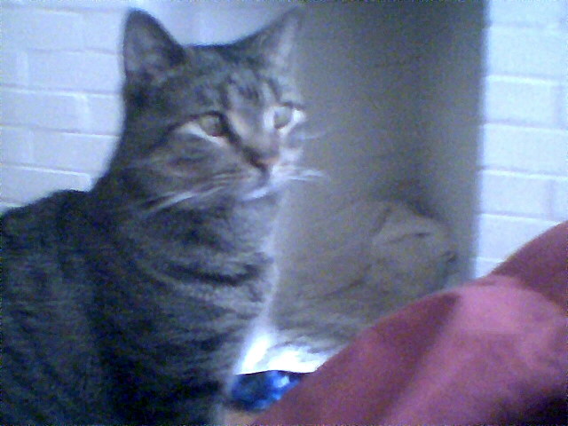 This is Mr. Magoo (Magoo) named such because he's very cross-eyed! He's extremely sweet, playful & loving. He's also very quiet so he's easy to over-look but when he wants attention he finds his choice of human & sits in their lap! Magoo sleeps in interesting places (bathroom) and positions (falling out of the cat bed). If allowed, he'll survive on a diet of BBQ potato-chips, pound cake, marble preferred, pancakes, vanilla ice cream & the smell of coffee...he begins every day with several good whiffs!